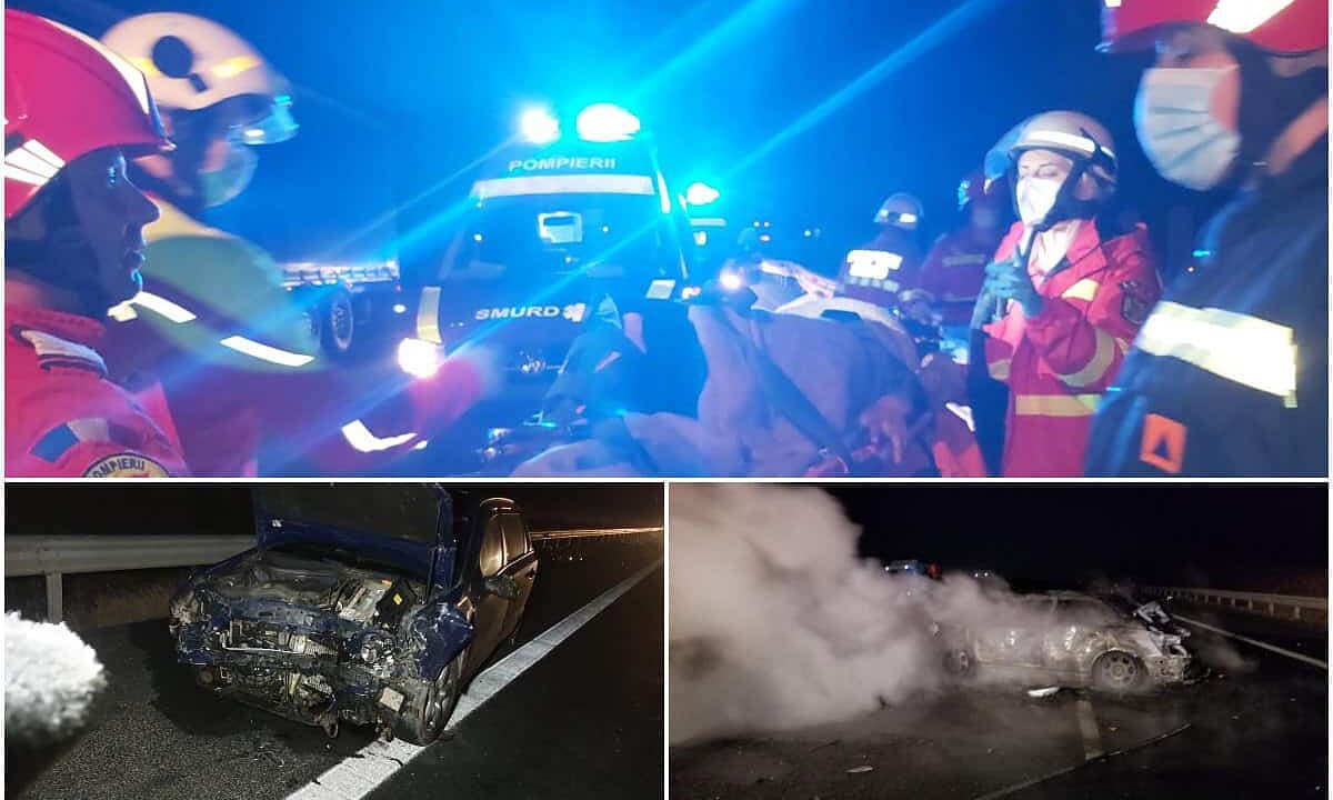 Primul autoturism ar fi pierdut controlul asupra direcției de deplasare, intrând în coliziune cu parapetul median, după care a rămas pe partea carosabilă și a luat foc.