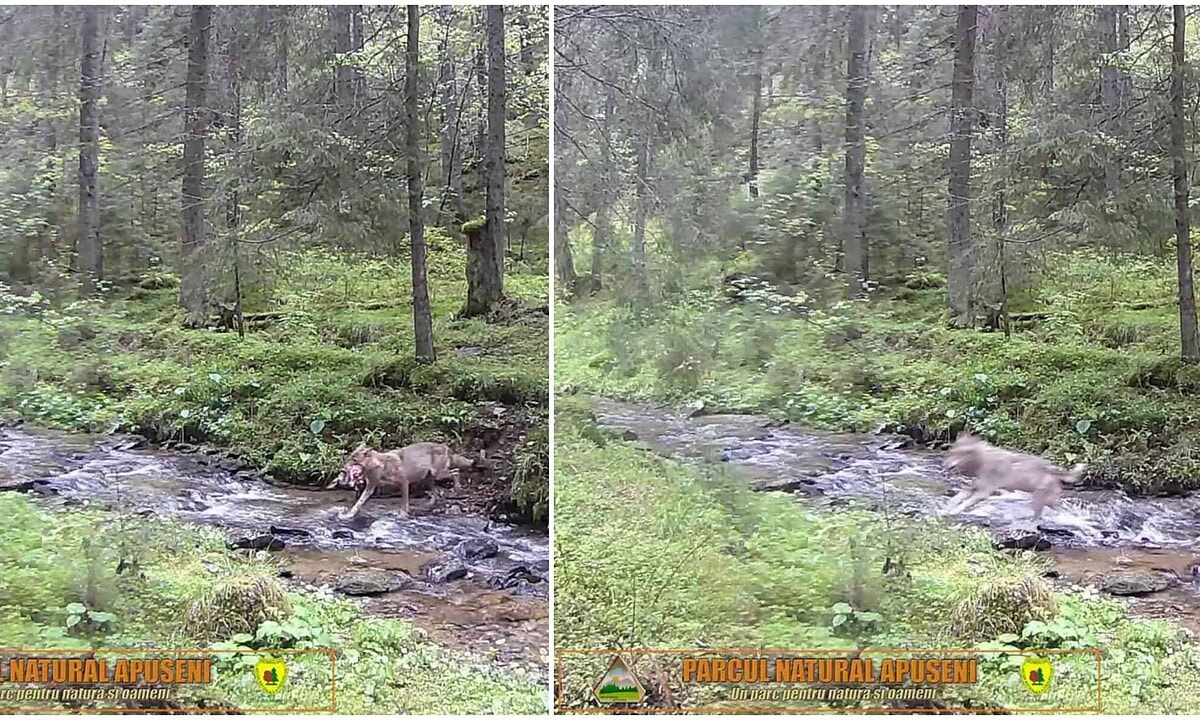 Imagini inedite au fost surprinse de camerele de monitorizare din Parcul Natural Apuseni: un lup cu pradă și unul șchiop, în lupta pentru supraviețuire chiar și în condiții dificile.