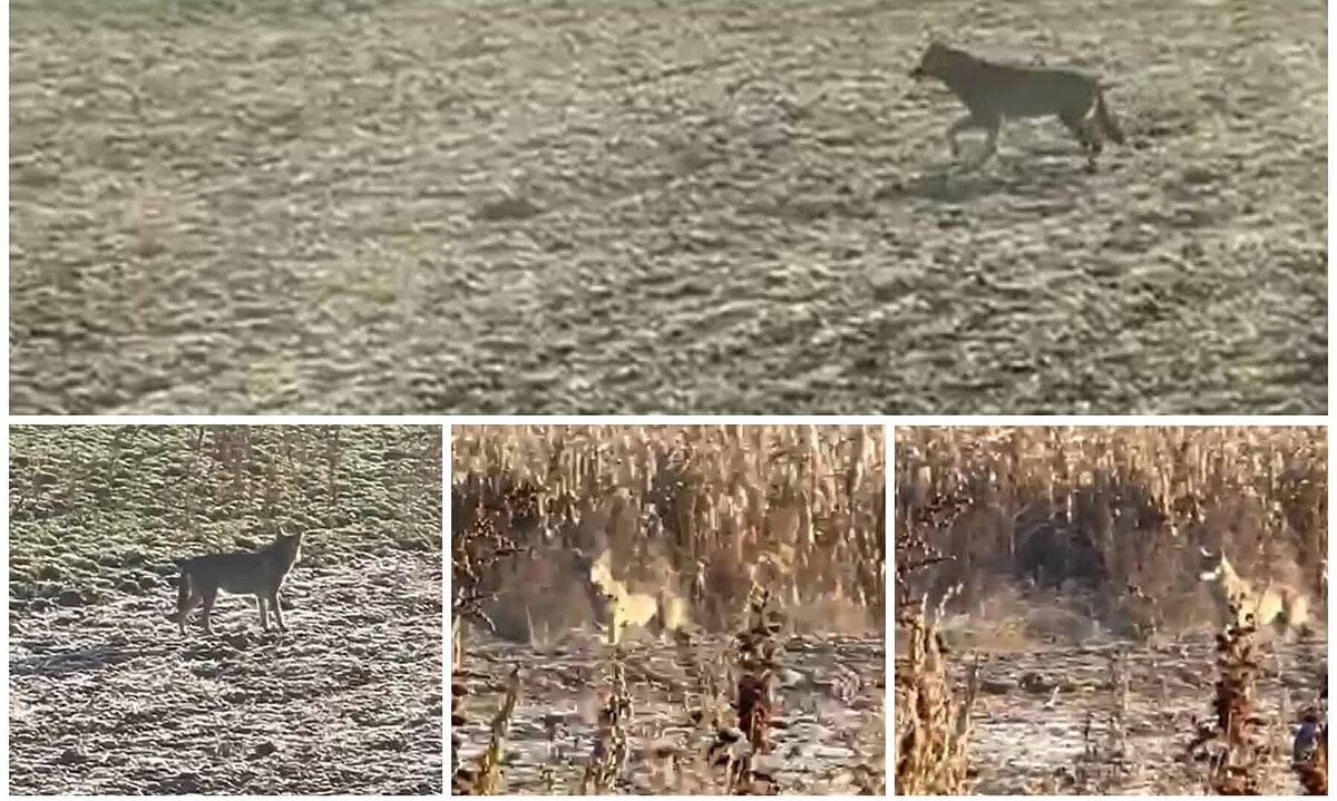 Animalul nu pare speriat de prezența omului care filmează dintr-un utilaj aflat pe câmp.