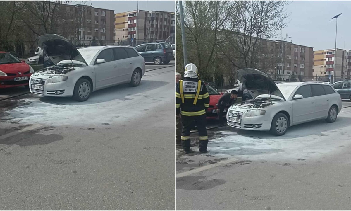 O mașină a fost cuprinsă de flăcări, duminică, 31 martie, în jurul orei 14.40, pe strada Gheorghe Șincai din Alba Iulia. Mașina a luat foc în parcarea magazinului Dedeman.