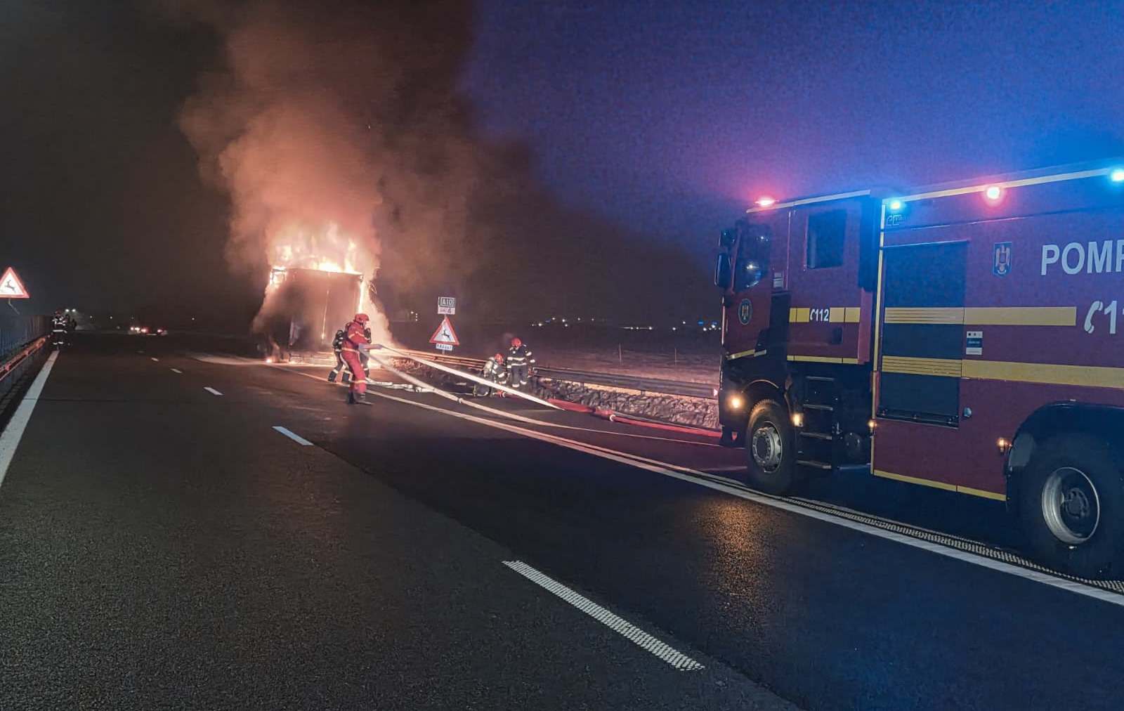 Un incendiu a fost semnalat în noaptea de luni spre marți pe autostrada A10, sensul de mers Alba Iulia - Sebeș. Remorca unui camion a luat foc.