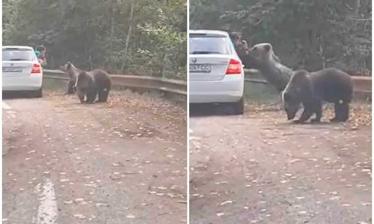 Doi turiști au fost filmați în timp ce încearcă să surprindă fotografii cu doi urși, într-un mod periculos. Au ieșit pe geam, iar un urs a sărit pe mașină.