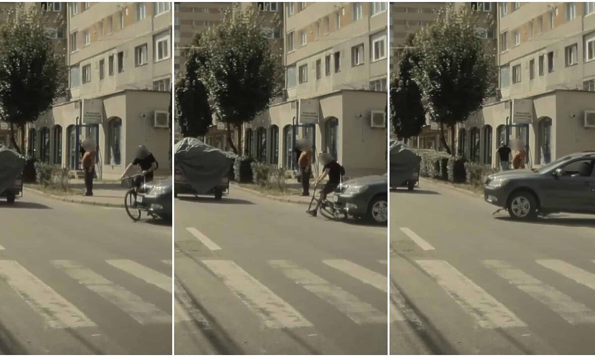 Pe imagini se observă cum un tânăr se deplasează pe bicicletă, pe trotuar, dinspre B-dul Revoluției 1989 spre B-dul 1 Decembrie 1918.