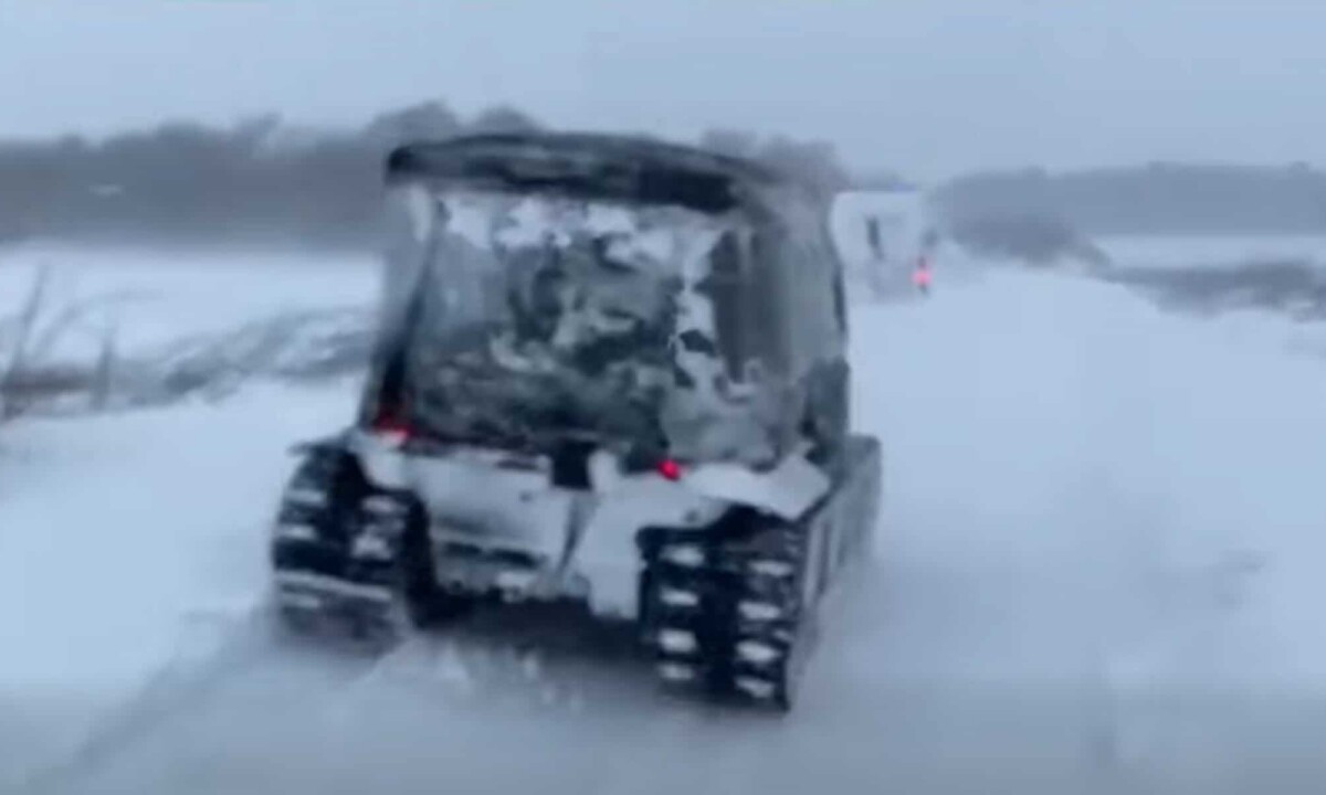 Din cauza zăpezii și a viscolului, intervenția se realizează cu autosenilată UTV.