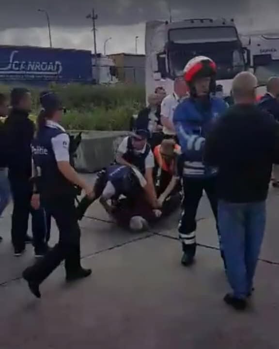 VIDEO: Razie a Poliţiei belgiene, într-o parcare din Bruges, în care se aflau mai mulţi şoferi de TIR români. Amenzi şi persoane escortate la secţie