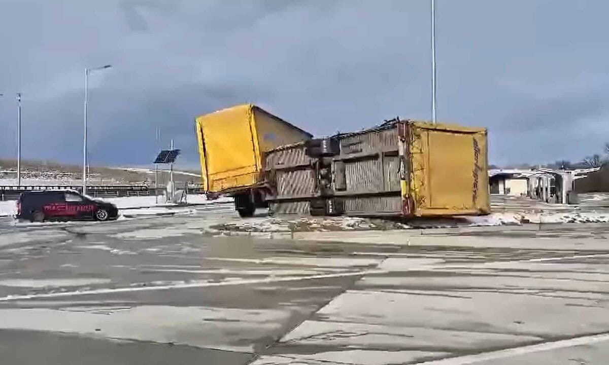 VIDEO: Remorca unui camion, răsturnată de vântul puternic într-o parcare de pe Autostrada A1, în Sibiu
