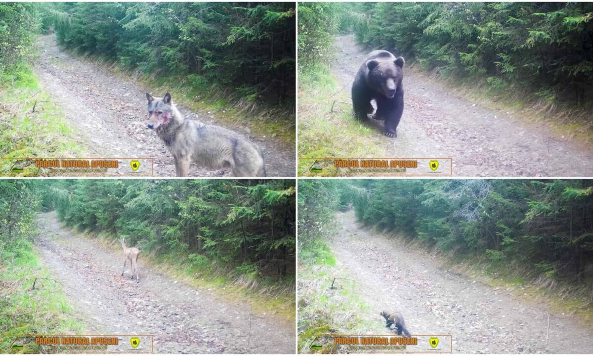Spectacol în sălbăticie, în Parcul Natural Apuseni. Reprezentanții Parcului Natural Apuseni au publicat joi, pe pagina de Facebook, o filmare surprinsă de o cameră de monitorizare în inima naturii, în care apar un urs, un țap, un lup și un jder, toate speciile fiind surprinse în același cadru natural.