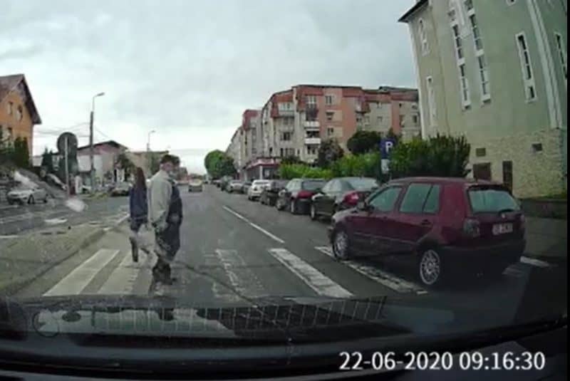Pe imagini se vede cum șoferul care a filmat oprește mașina pentru a le acorda pietonilor prioritate pe trecere. În acel moment, un alt autoturism trece fără să încetinească pe lângă el, prin fața unui bărbat care tocmai traversa.