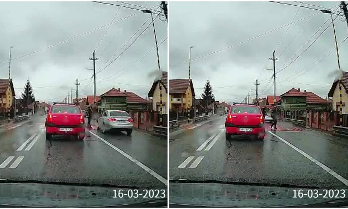 O mașină care se afla pe banda 2 oprește pentru a le acorda prioritate, însă șoferul unui alt autoturism marca Audi, care circula pe banda 1, trece la câțiva centimetri de aceștia.