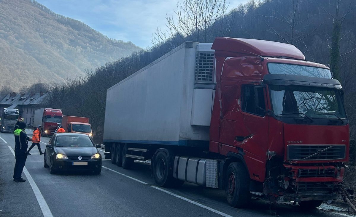 A avut loc o coliziune între un ansamblu rutier și un autoturism. În urma accidentului, au rezultat doar pagube materiale.