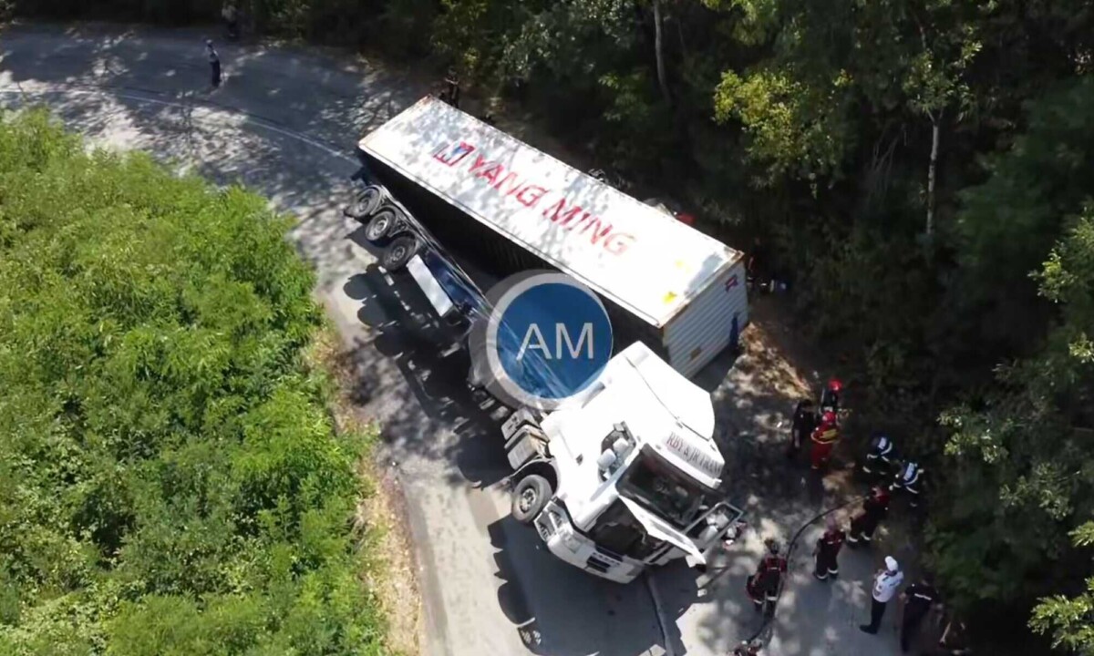 Din câte se pare autotrenul transporta un container metalic care s-a răsturnat peste un autoturism aflat în trafic. Persoana din autoturism a fost strivită sub greutatea containerului.