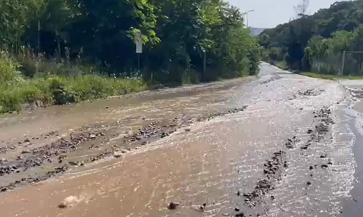 Carosabilul din zona Valea Popii s-a transformat, sâmbătă, într-un pârâu, cum se întâmplă de cele mai multe ori după precipitații abundente. Apa se scurgea pe carosabil, cu aluviuni aduse din pădure.