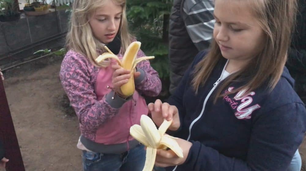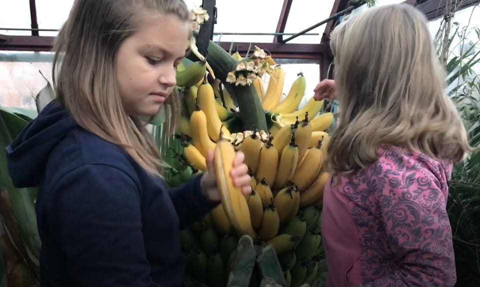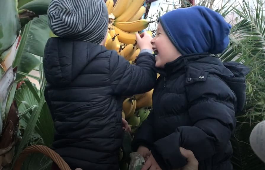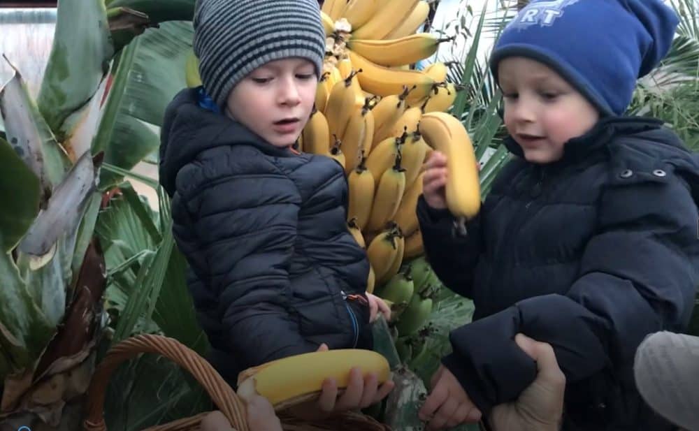 Prima recoltă de banane din ”sera cu minuni” de la Alba Iulia a fost deja culeasă. Proprietarul, domnul Nelu, și-a chemat în ajutor nepoții și copiii unor prieteni, bucuroși să rupă direct din ciorchine, fructele exotice coapte, 100% bio și extrem de aromate. Întreaga recoltă a acestui an ajunge la aproape 150 de kilograme și reprezintă producția a doi bananieri plantați în joacă, într-o anexă a gospodăriei.
