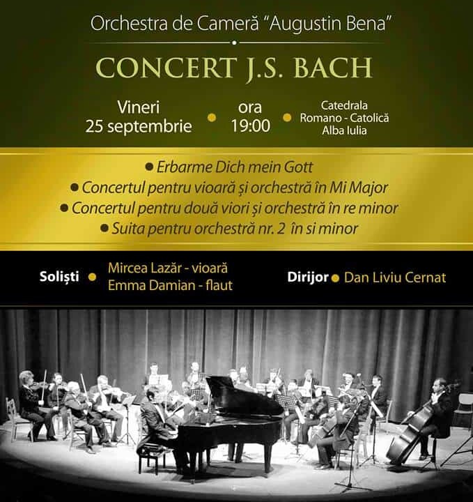 Invitaţii speciali ai evenimentului sunt violonistul Mircea Lazăr şi flautista Emma Damian, iar orchestra va fi condusa de dirijorul Dan Liviu Cernat. Dea semenea vă veţi putea bucura de bogaţia acustică a Catedralei Romano-Catolice din Alba Iulia care este în perfectă armonie cu muzica lui J.S. Bach.