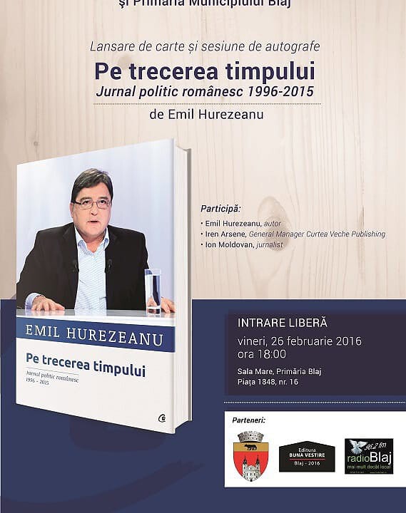 VINERI: Emil Hurezeanu lansează la Blaj volumul „Pe trecerea timpului. Jurnal politic românesc 1996-2015”