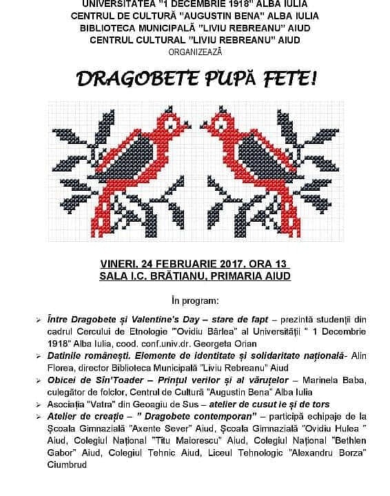 Vineri, 24 februarie, de la ora 13.00, în sala Ion I.C. Brătianu a Primăriei Municipiului Aiud se va desfăşura un eveniment pentru marcarea sărbătorii de Dragobete.