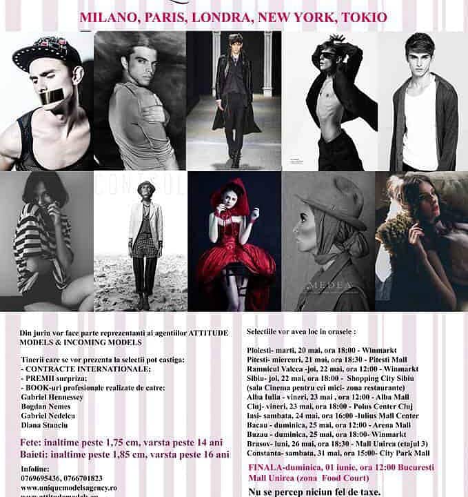 “Unique Face Contest 2014” este un eveniment pentru tinerii care vor să se afirme ca modele internaţionale la Milano, Paris, Londra, New York şi Tokio. Băieţii trebuie să aibă vârsta minimă de 16 ani şi înălţime peste 1,85 metri. Fetele cu vârste de minimum 14 ani se pot prezenta la preselecţie dacă au cel puţin 1,75 metri înălţime.