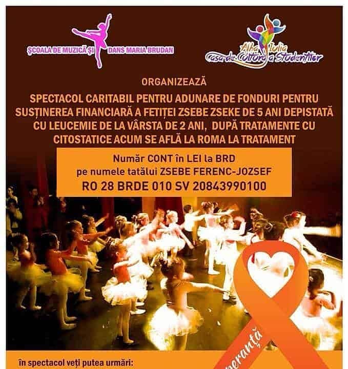 Școala de Muzică și Dans "Maria Brudan" și Casa de Cultură a Studenților organizează un spectacol caritabil, pentru a sprijini financiar o fetiţă de 5 ani, Zsebe Szeke, care a fost diagnosticată cu leucemie, de la vârsta de 2 ani.