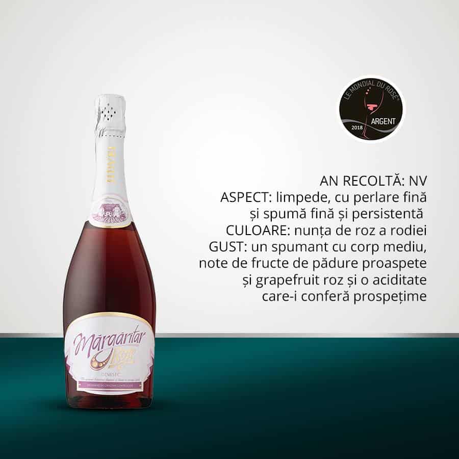 La finalul lunii aprilie, competiția Concours Mondial Du Rose a sărbătorit exclusiv vinurile roze ale lumii, care au devenit un fenomen popular la nivel global. În fiecare an, juriul alcătuit din 60 de experți degustători, evaluează și notează mostrele prezentate, după care, ulterior, se consultă pentru stabilirea câștigătorilor, premiile oferite constituind o garanție a calității pentru un număr larg de cumpărători. Prin urmare, medalia de argint acordată vinului Mărgăritar Roze NV reprezintă o distincție valoroasă a acestuia.