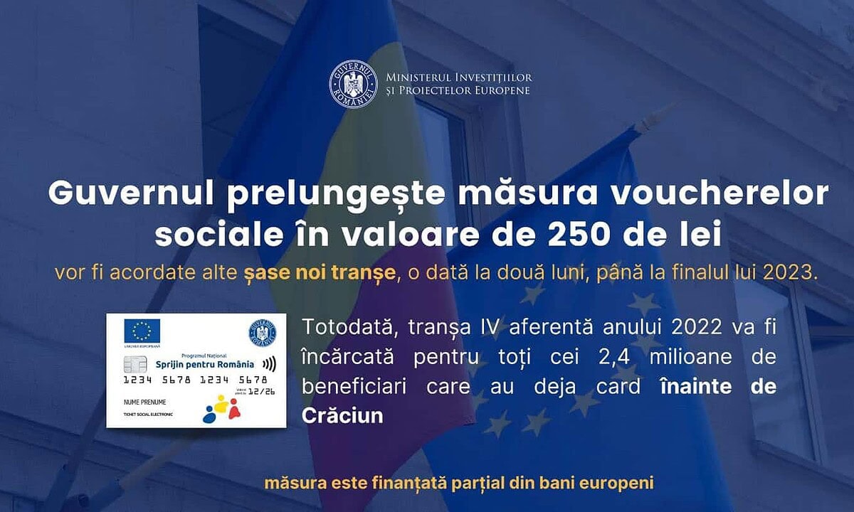 Acordarea tichetelor sociale de 250 lei anumitor categorii de persoane vulnerabile și familii, pentru alimente și mese calde, va continua și anul viitor. Astfel, plata ajutoarelor sociale urmează să fie făcută în șase tranșe în 2023, din două în două luni, pentru acoperirea unei părți din cheltuielile cu hrana, transmite Ministerul Investițiilor și Proiectelor Europene.
