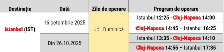 Astfel, din 16 octombrie 2025, zborurile din Cluj-Napoca spre Aeroportul Internațional iGA Istanbul au fost introduse zboruri cu 2 frecvențe pe săptămână, în zilele de joi și duminică.