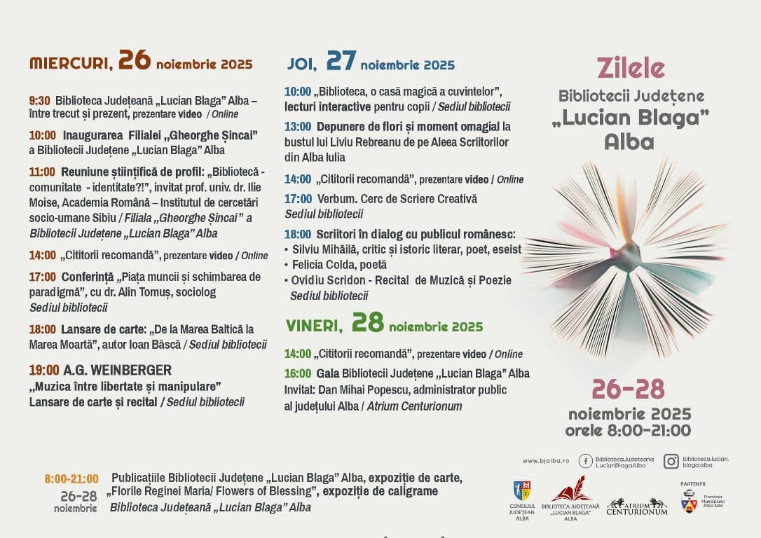 Zilele Bibliotecii Județene „Lucian Blaga” Alba sunt organizate în perioada 26-28 noiembrie 2025. Sunt prezentate expoziții și lansări de carte. Va fi inaugurată biblioteca din cartierul Gheorghe Șincai.