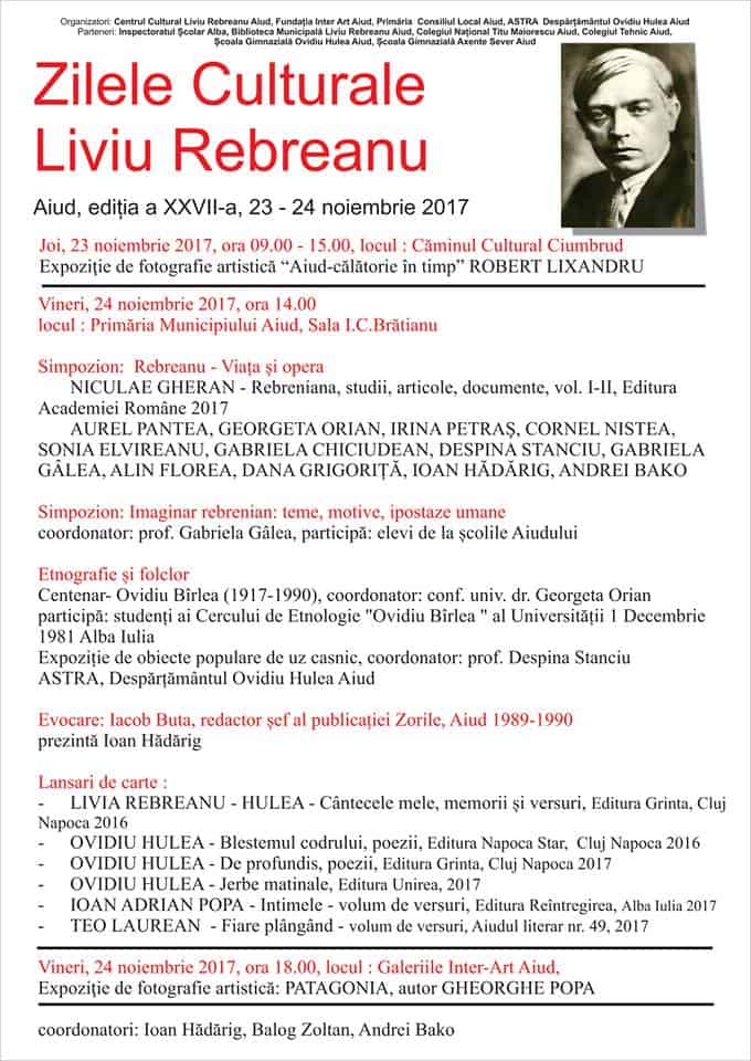 În perioada 23-24 noiembrie, la Aiud este organizată a XXVII-a ediţie a evenimentului “Zilele Culturale Liviu Rebreanu”. În două zile, cei prezenți îi vor aduce un omagiu scriitorului, prin expoziție de fotografie şi obiecte populare, lansări de volume tematice și discuţii literare.