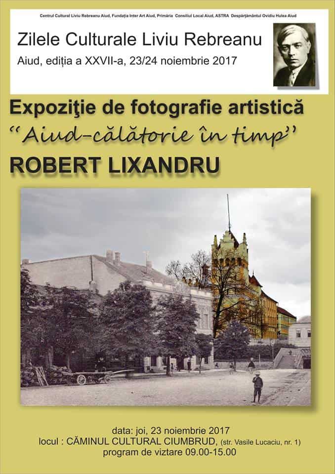 Orele 9.00 - 15.00, Expoziţie de fotografie artistică “Aiud - călătorie în timp” – Robert Lixandru; locaţia Căminul Cultural Ciumbrud
