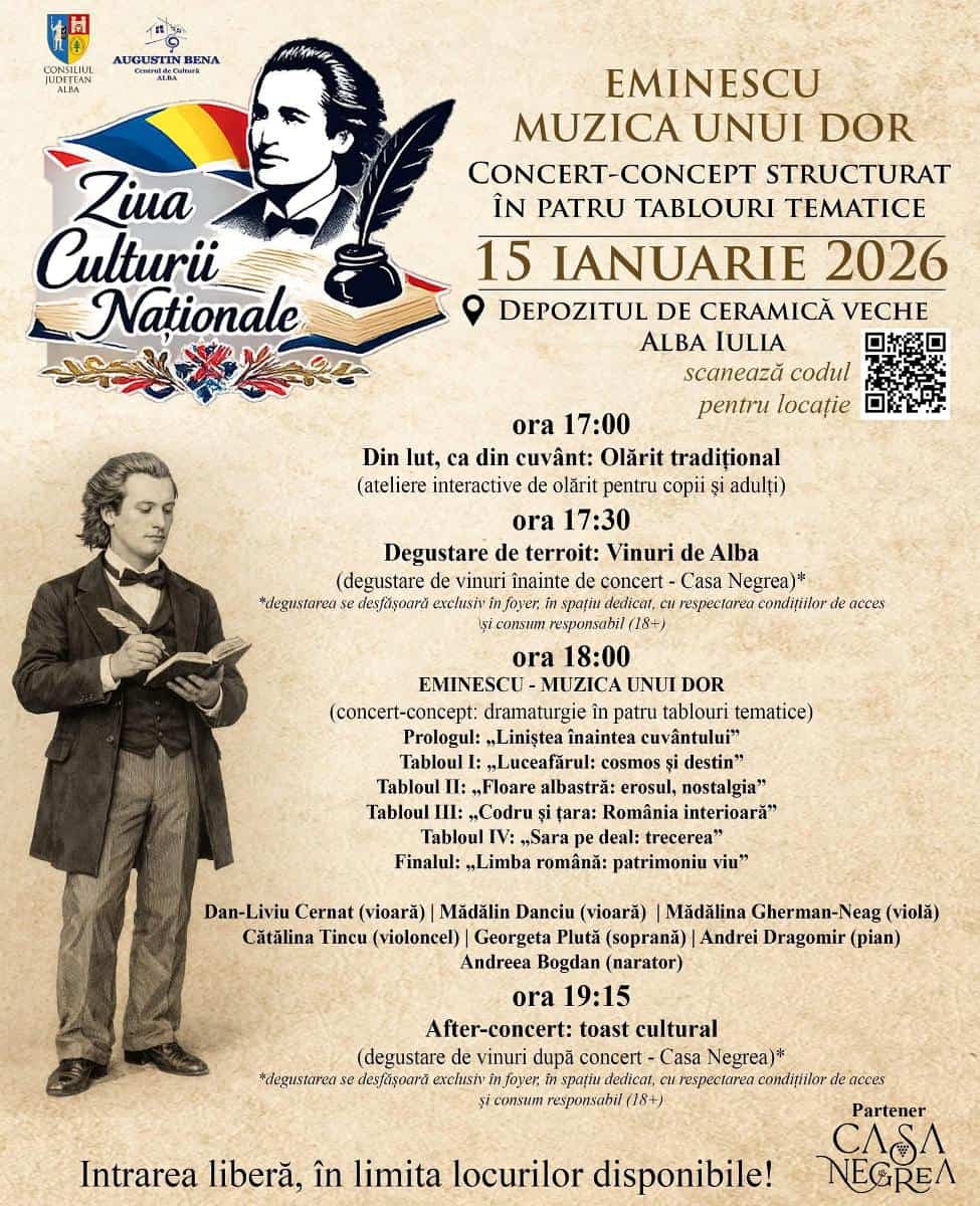 Ziua Culturii Naționale va fi sărbătorită la Alba Iulia prin mai multe evenimente organizate la Depozitul de ceramică veche. Proiectul ”Eminescu – Muzica unui dor”, propune ateliere interactive, degustare de vinuri și un concert-concept în patru tablouri tematice.